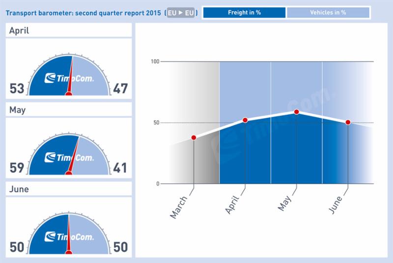 TimoCom's transport barometer finally booming in the 2nd quarter of 2015. An impressive freight to vehicle ratio of 54:46 confirms the figures from this year's first quarter. There are various reasons for this positive development.