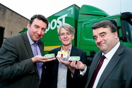 From Nenagh to Nice, Finding out how An Post's new freight service Post Logistics can help his business is John O'Brien (centre) MD of Nenagh based Turf Peat Incense Company. He is seen here with Liam O'Sullivan, An Post's Director of Mails Operations (right) and Hugh Corcoran who will run the new service. John's company manufactures a range of turf and peat incense products including a thatched cottage turf burner seen here at centre photo,